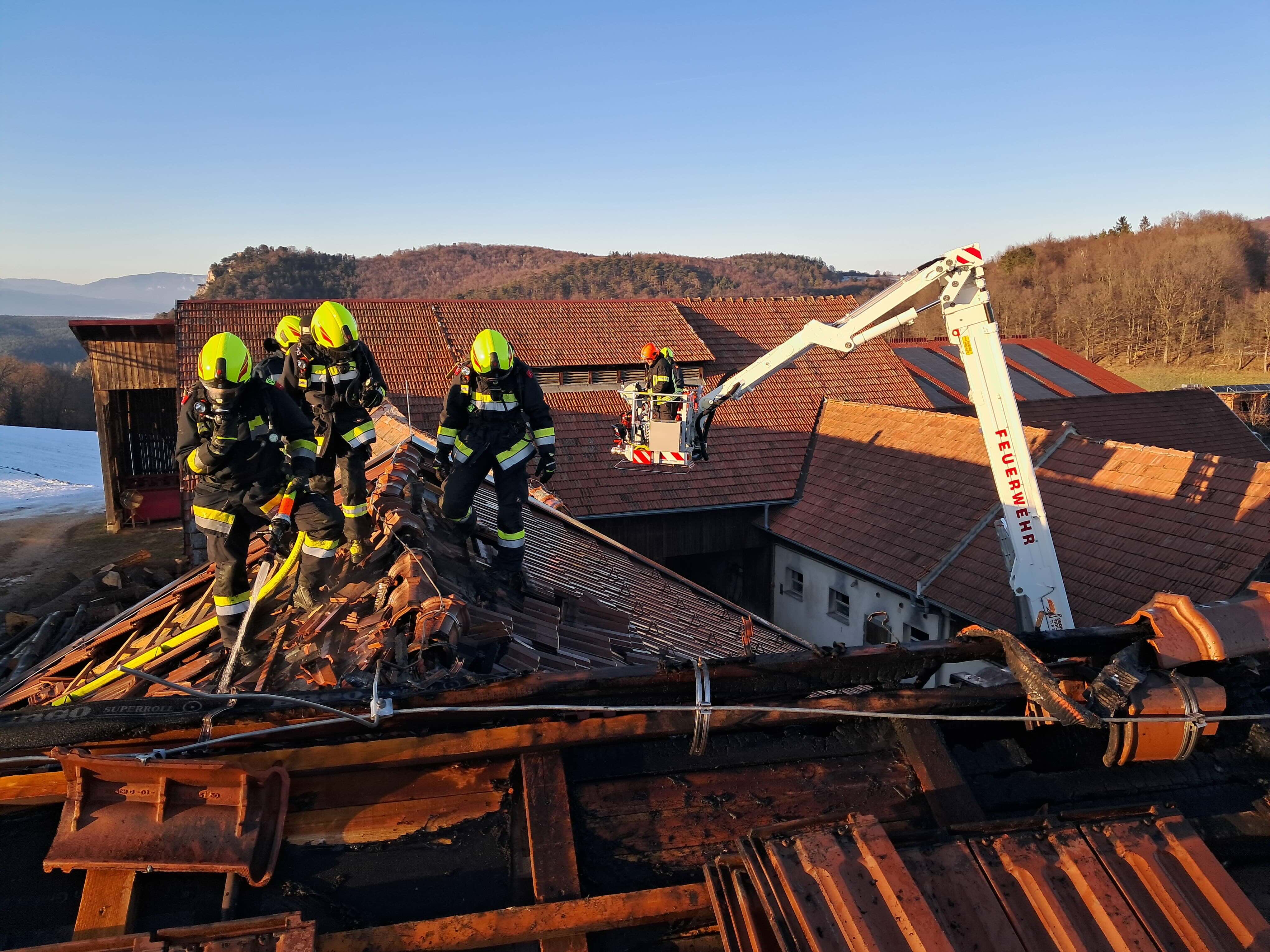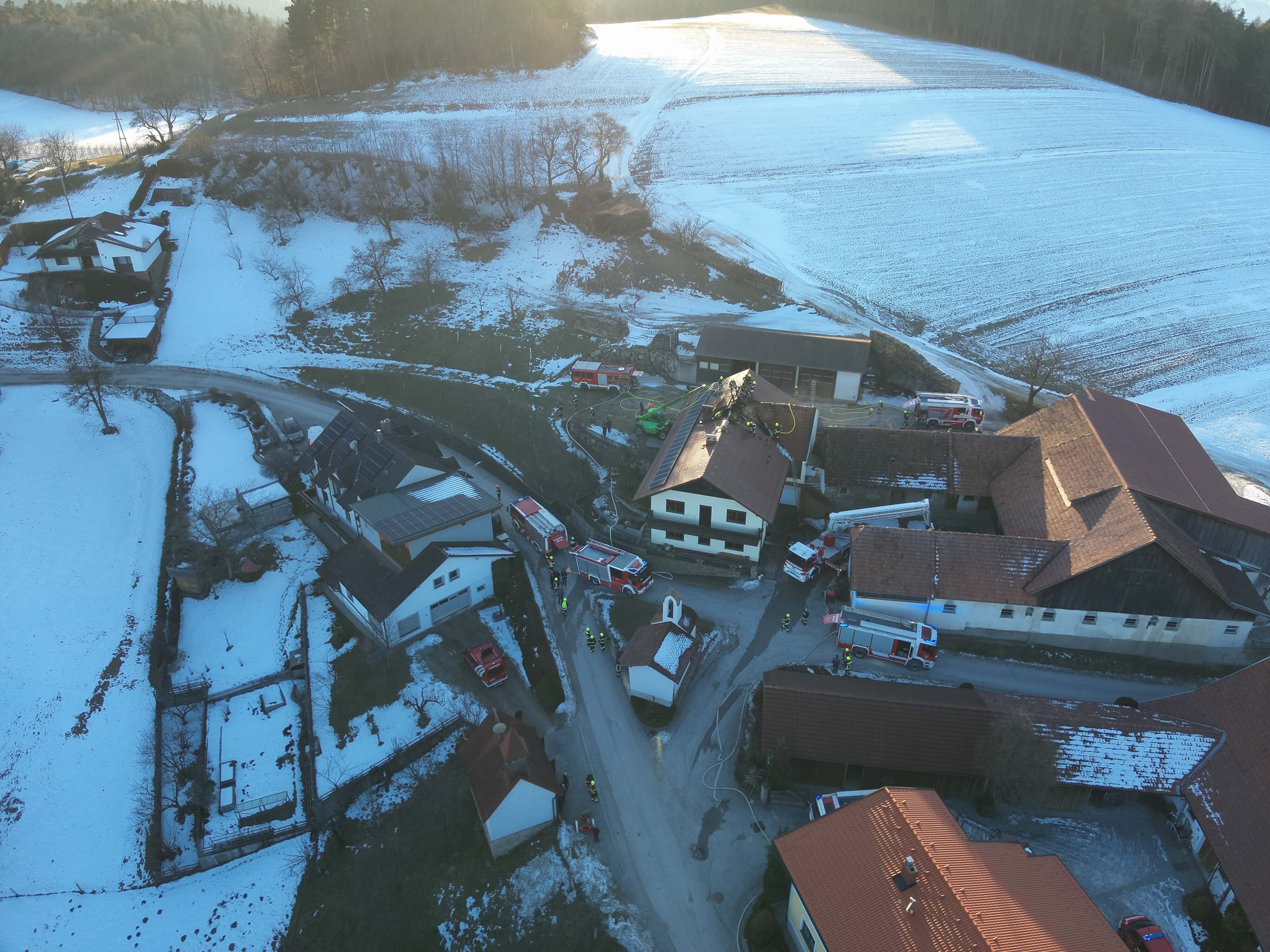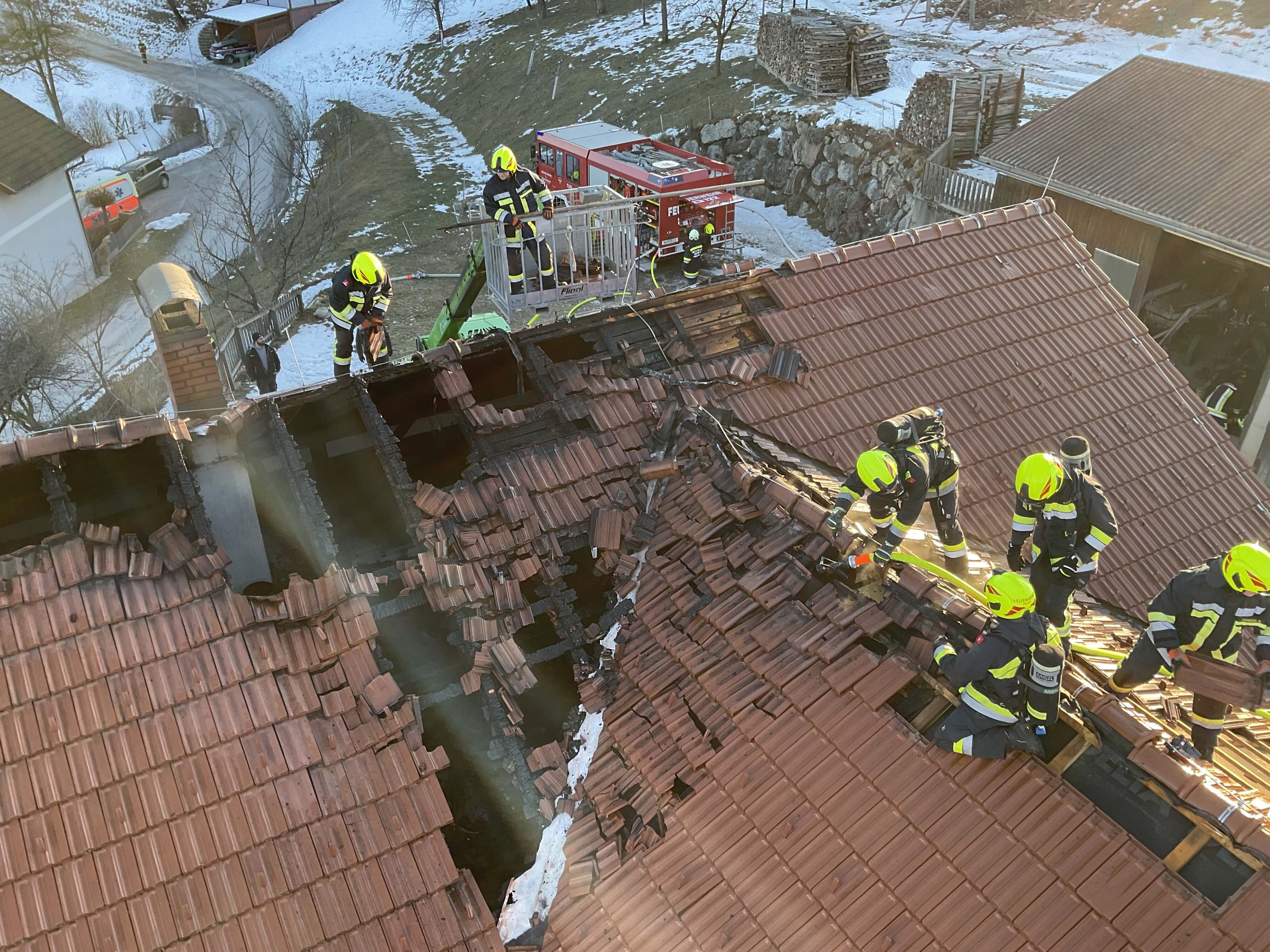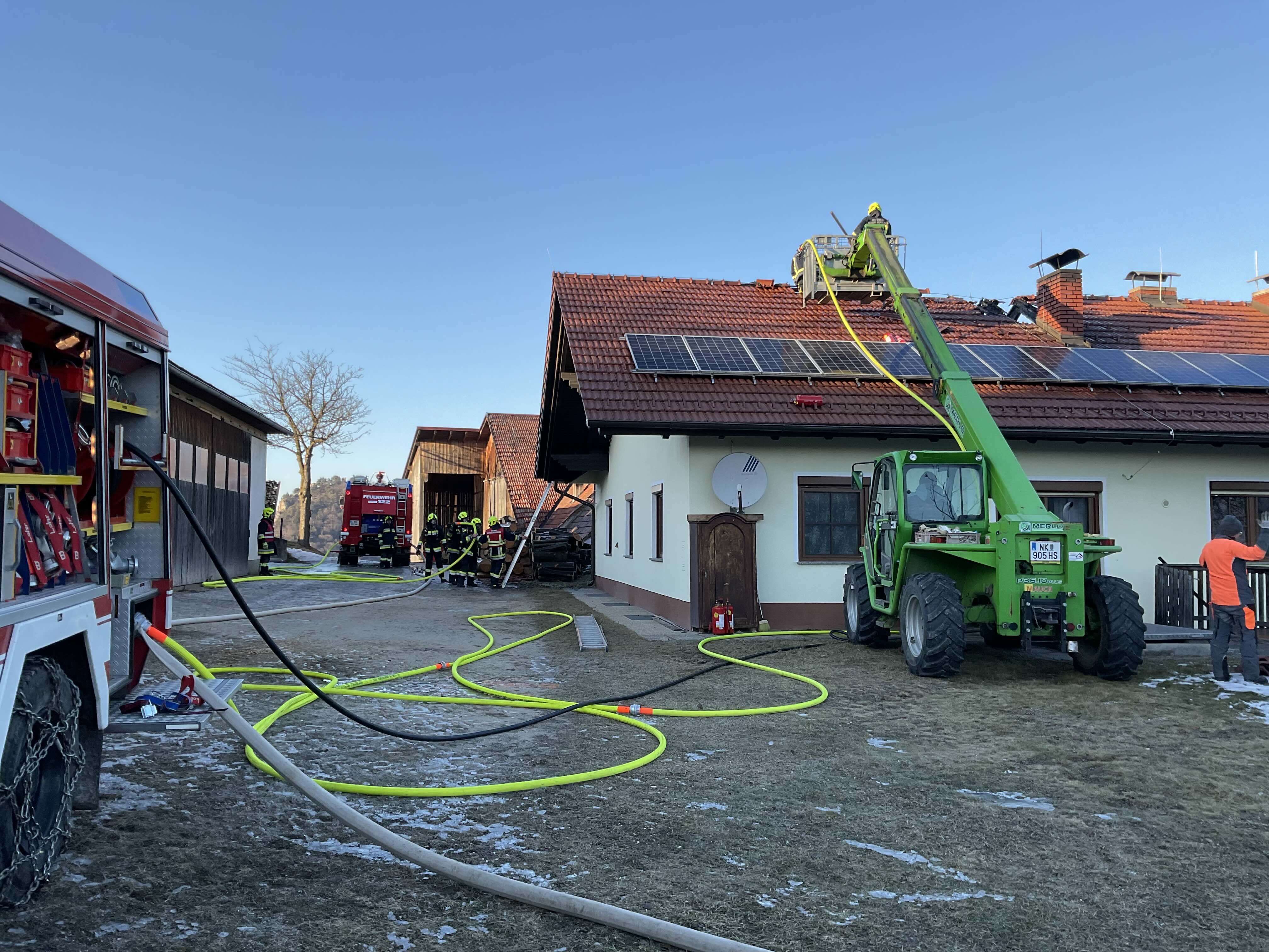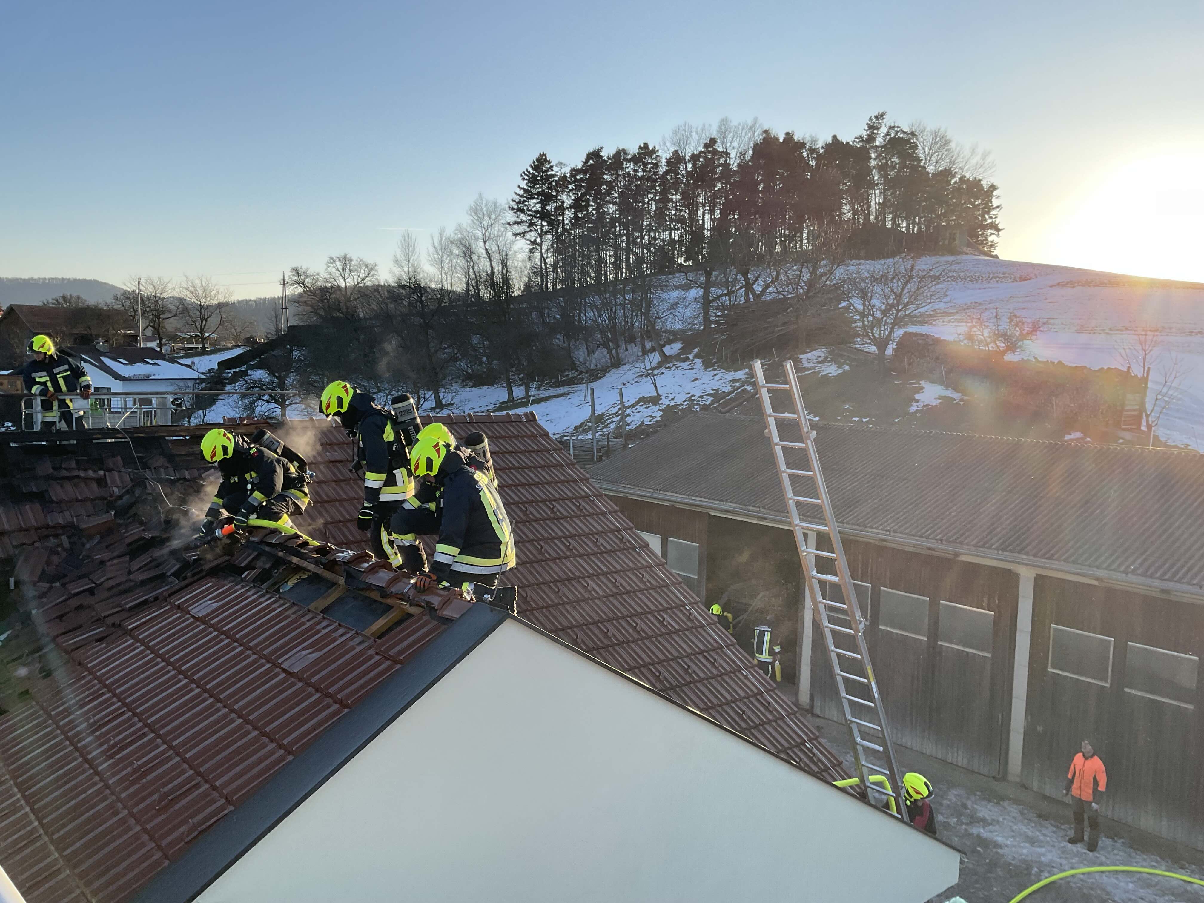 Beim Eintreffen der ersten Einsatzkräfte war eine starke Rauchentwicklung im Bereich des Dachstuhls des Wohngebäudes eines landwirtschaftlichen Betriebes feststellbar, wobei sich das Feuer bereits auf weitere Teile der Dachkonstruktion ausgebreitet hatte.