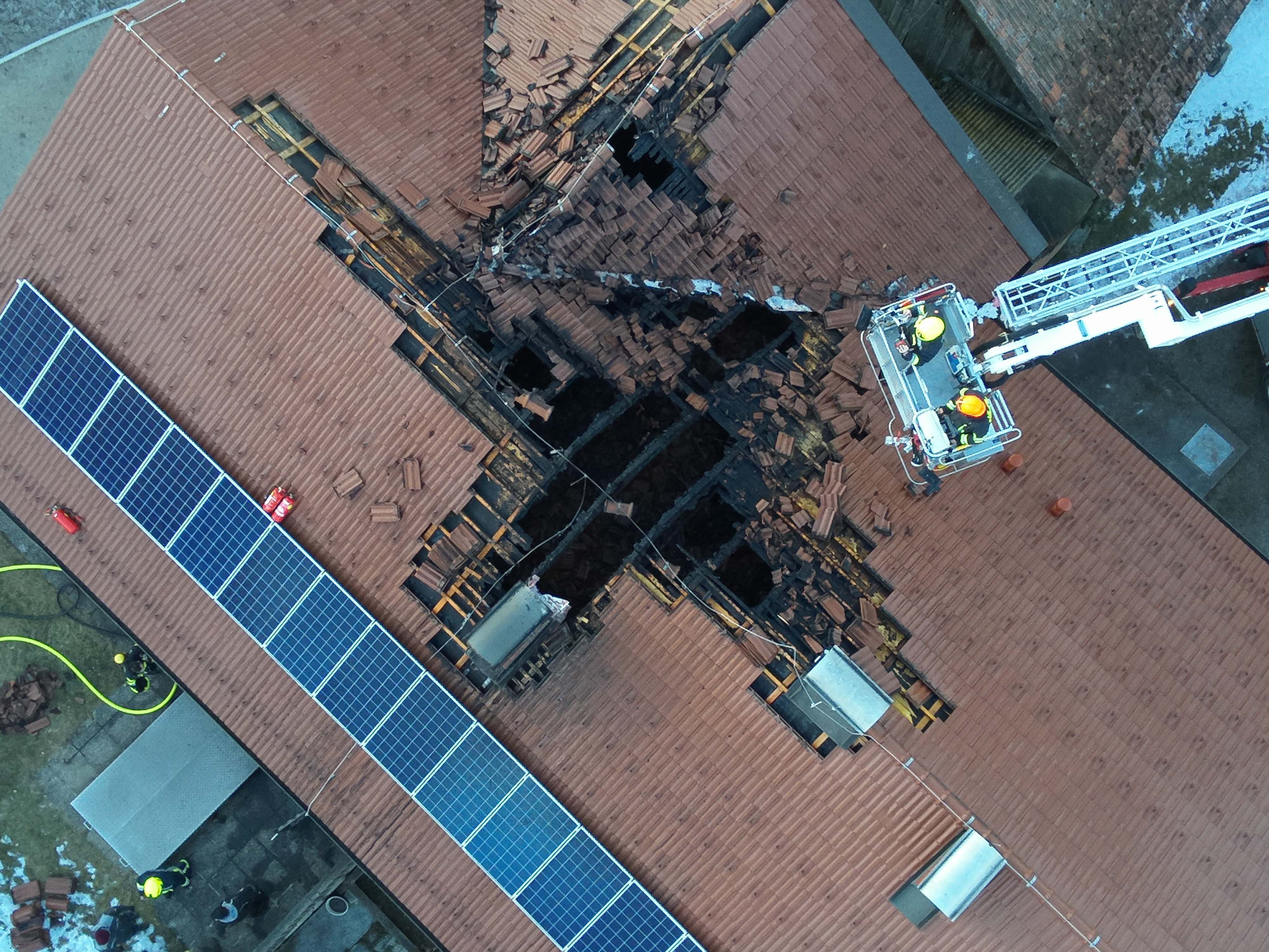 Mithilfe von Wärmebildkameras wurde der gesamte Dachbereich sowie angrenzende Gebäudeteile kontrolliert, um Glutnester zu erkennen und abzulöschen.